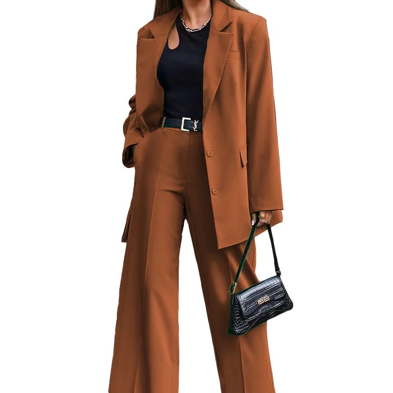 Elagent Solid Suit Two Pieces Outfits Office Lady Long Sleeve Lapel Jacket Coat Suits Women Casual Wide Leg Trousers Set
