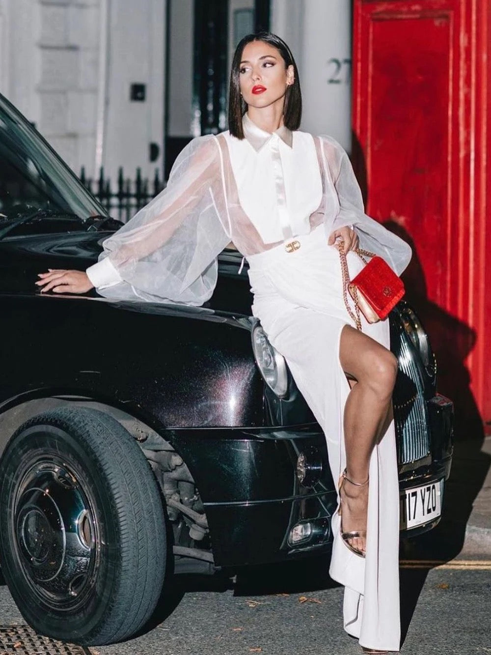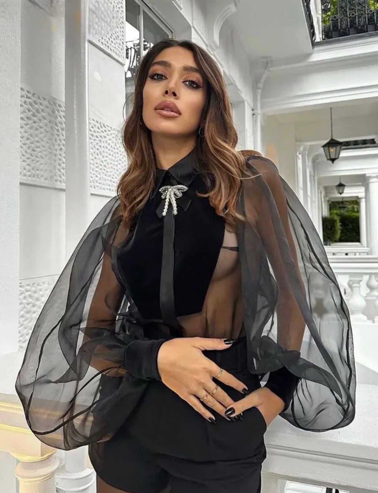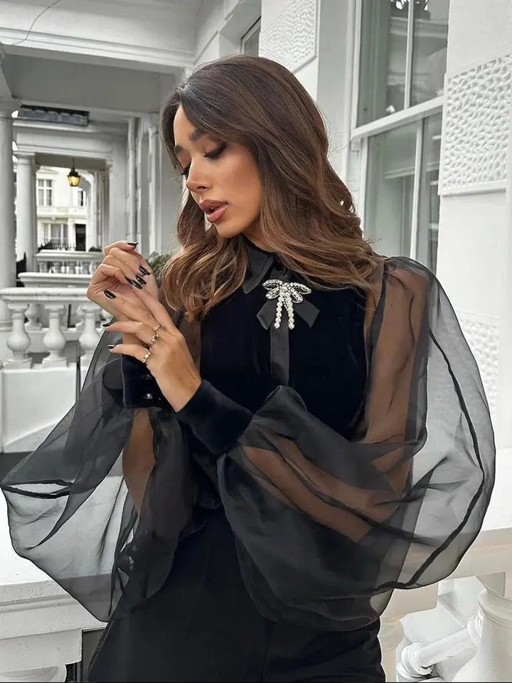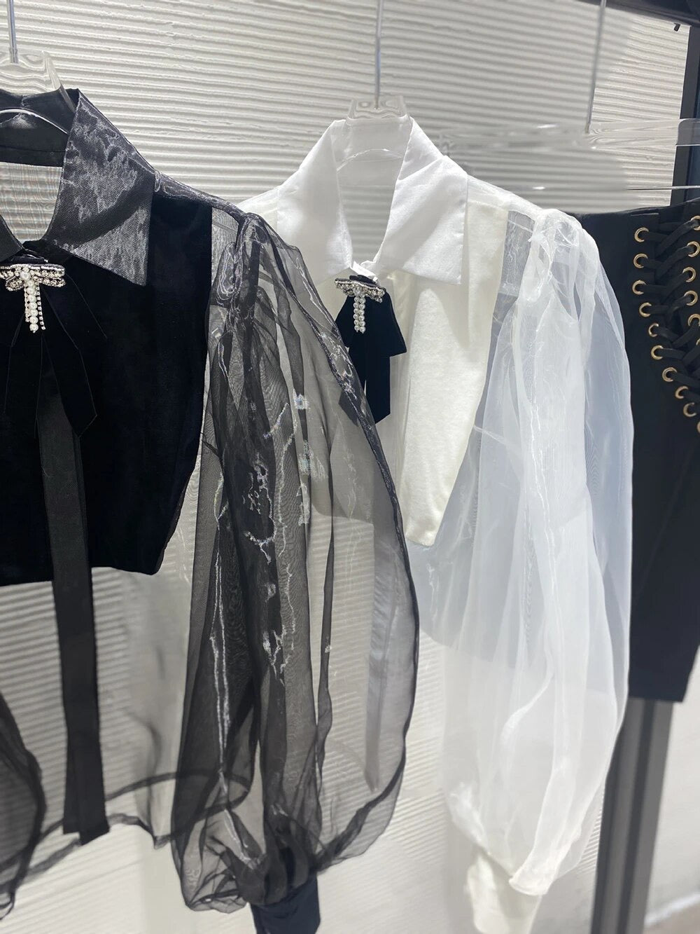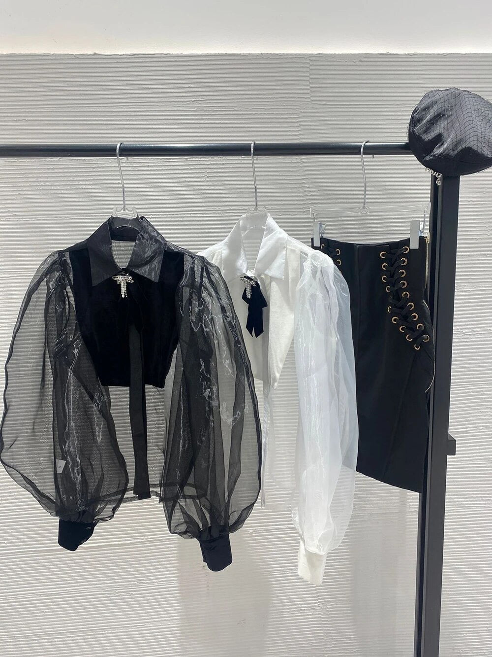 Sexy See Through White Diamond Brooches Shirts Loose patchwork Blouses for Women Fashion 2023 Streetwear Puff Sleeve Tops