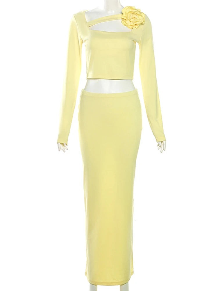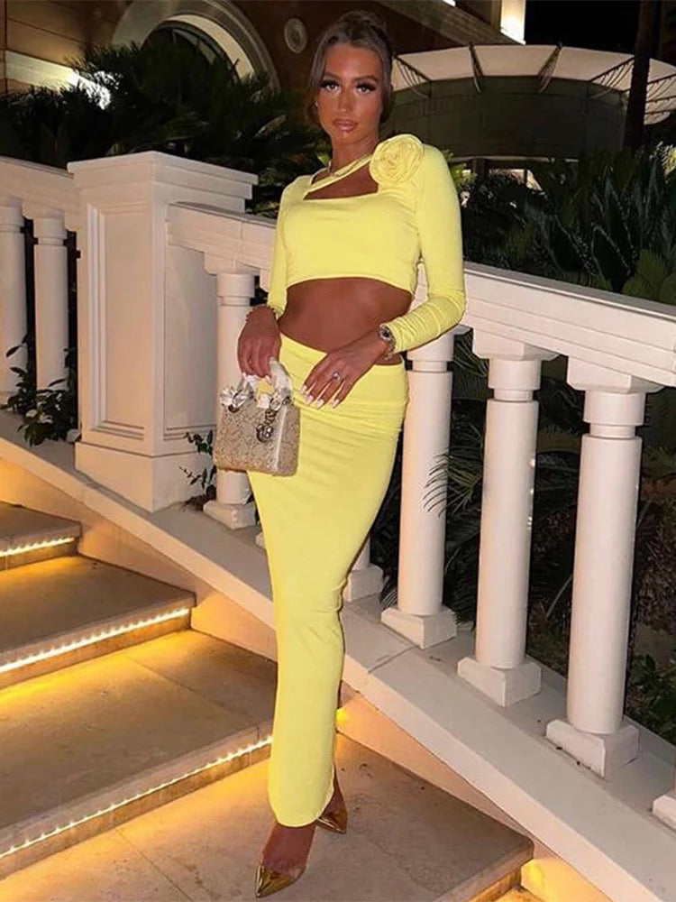 Elegant Party Maxi Dress Set Women Sexy Cut Out Tie Flower Long Sleeve Crop Top Bodycon Midi Skirt Matching 2 Pcs Set