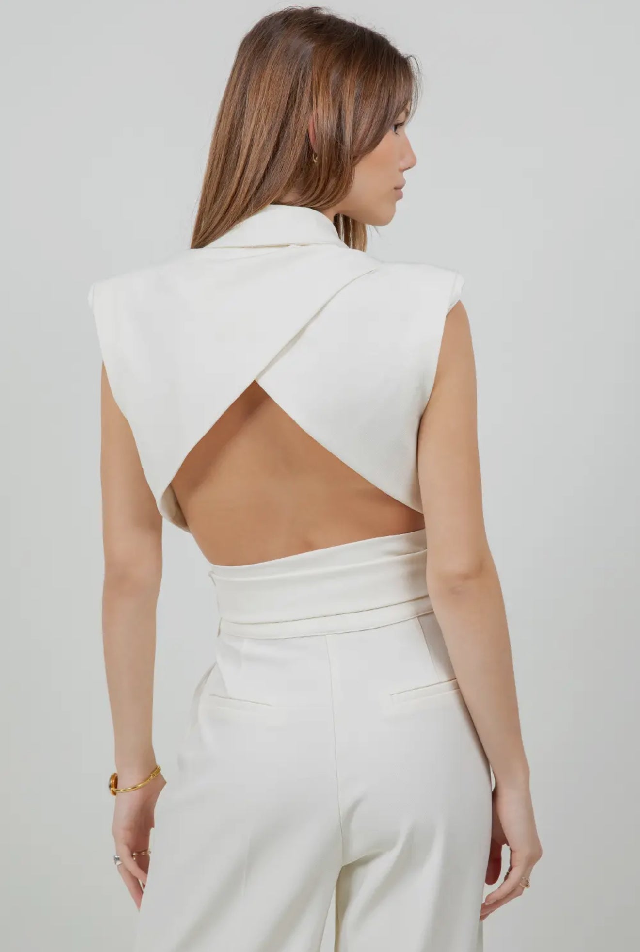 Command attention with this sleek and modern two-piece set. The sleeveless wrap blazer top features sharp lapels, a belted waist with statement buckle, and a bold open-back design that blends sophistication with edge. Paired with high-waisted tailored pants featuring a wrap overlay detail, this all-white set delivers effortless power dressing with a fashion-forward twist. Perfect for chic evenings, upscale events, or when you want to make a lasting impression.