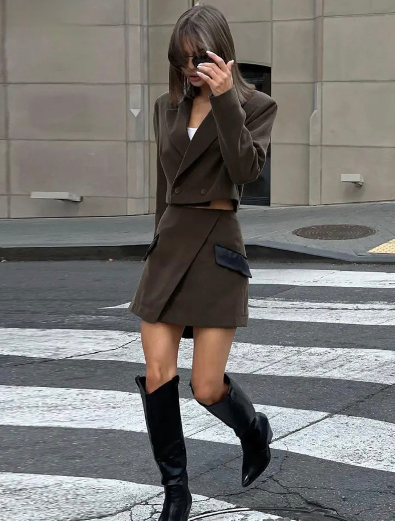 Set veshjesh 2-copëshe për femra në kafe dimërore të hollë, 2023, bluzë elegante me mëngë të gjata dhe mini funde me bel të lartë